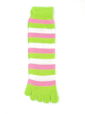 Bring a fresh and lively look to your feet with our Pink, White, and Green Stripe Toe Socks. This delightful color combination is perfect for spring or adding a bright touch to your outfit. Soft, durable, and fun, these socks are a must-have for any wardrobe.